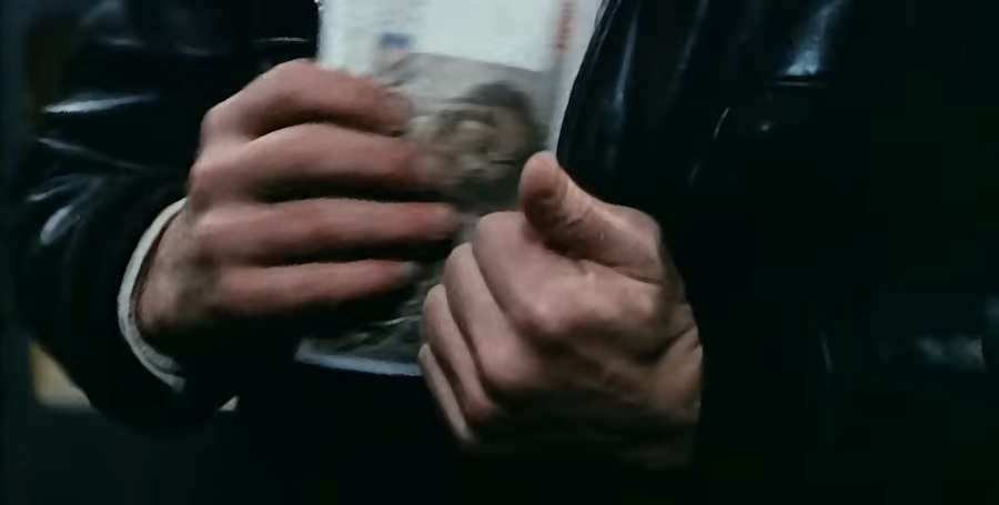 This begs the question: why did we follow her into the bank? The obvious reason is to establish the threat of Yvon harming and robbing the woman, but I don’t think that’s the sole reason. The mundanity of the scene is what sticks out to me. It’s both casual and business-like: hand in your ticket, sign the slip, collect your money, and get on with your day.